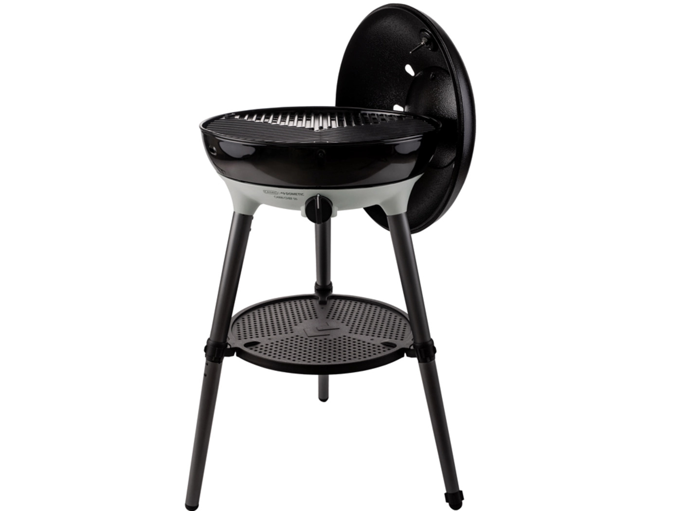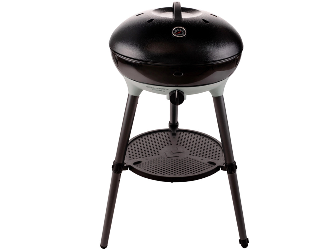 The dome lid, equipped with a stay-cool handle and built-in thermometer, conveniently hooks onto the side of the BBQ to double as a windshield. A handy utility shelf provides space for storing tools, spices, and condiments, keeping everything within easy reach.