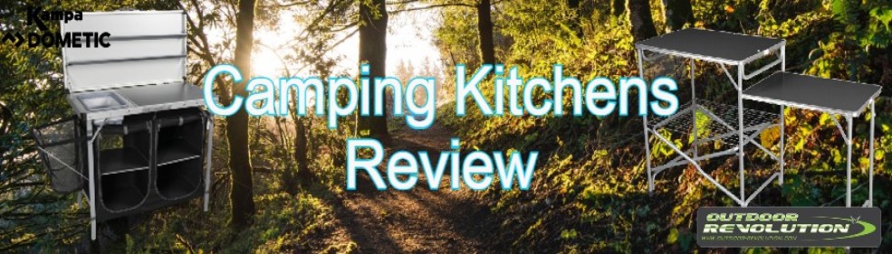 Outdoor Camping Kitchens Review This high quality range is constructed of elasticated concertina aluminium top and lower shelf, side tables of composite with laminate and powder coated steel frame. Offering large work surfaces, storage cupboards with 600D PVC coated fabric and two level shelving with rigid shelf inserts. They are sturdy easy to erect and simply folds down flat so it can be transported and stored compact in its own storage carry bag. The Removable Windshield  to keep the wind at bay are included.