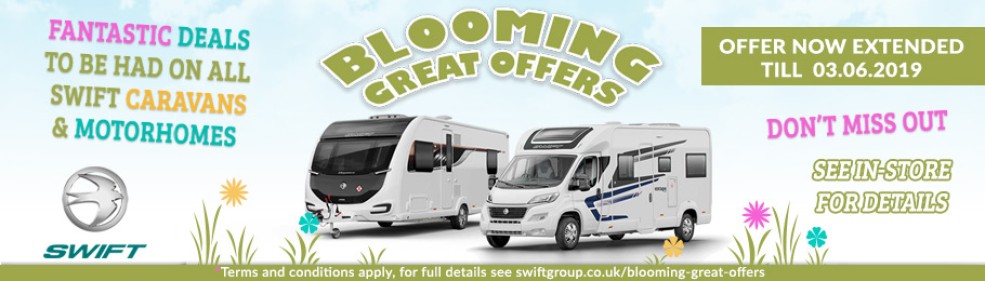*Terms and conditions apply. Offers available when buying a 2019 touring caravan or motorhome from the Swift range between 29th March and 7th May 2019.